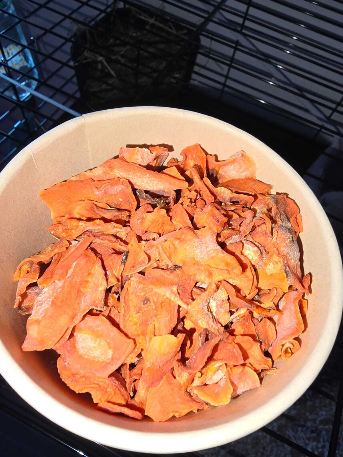 Snack natural a base de zanahoria deshidratada de manera tradicional, conservando todo su sabor. Alimento sin colorantes, conservantes o azúcares añadidos.