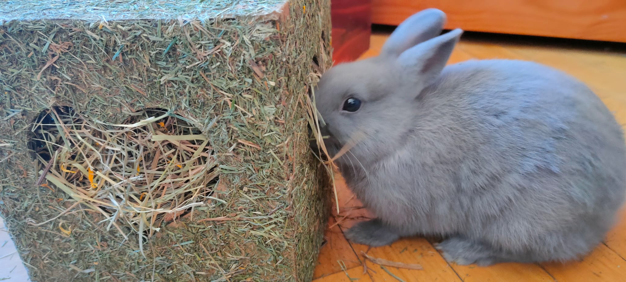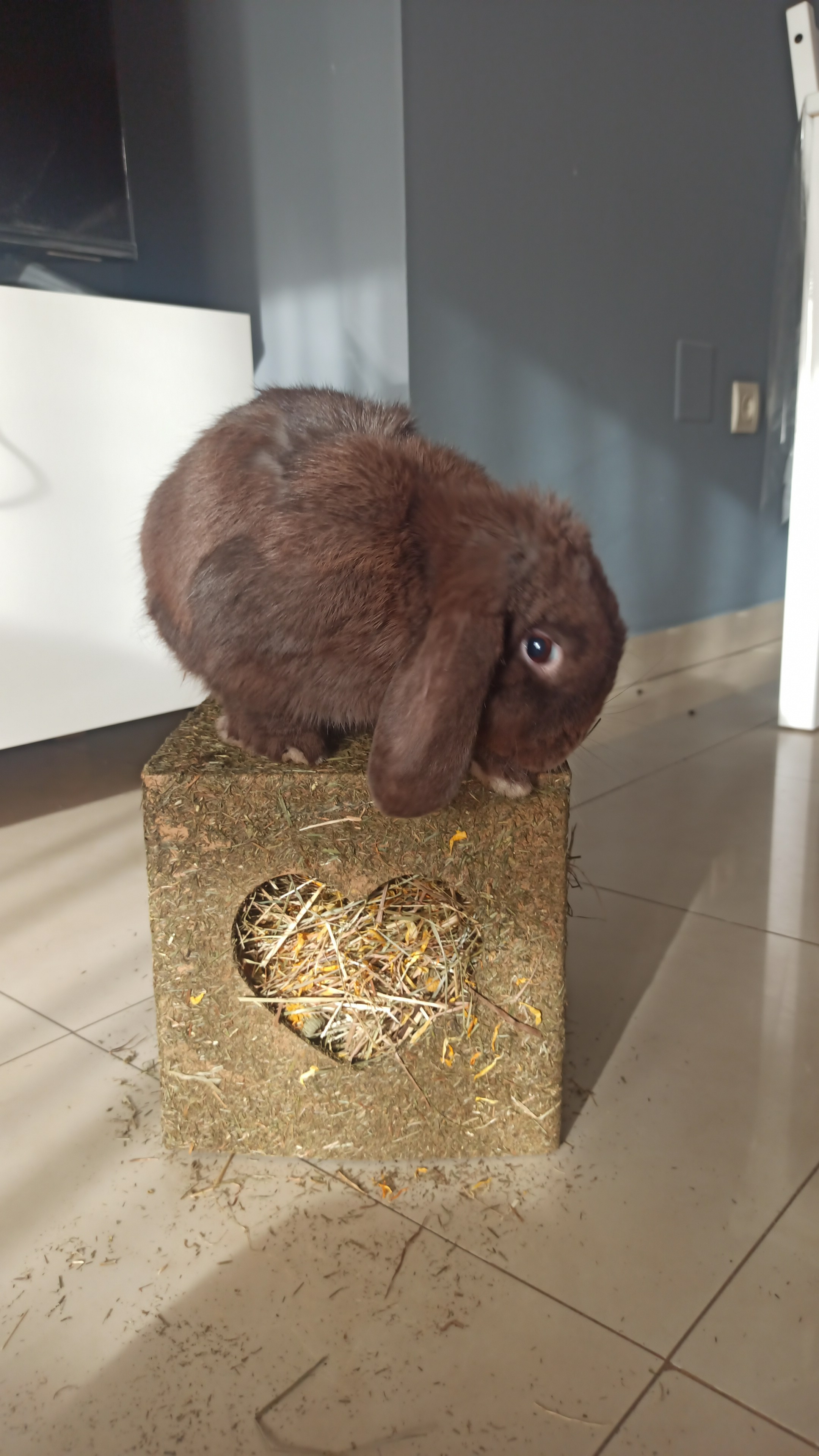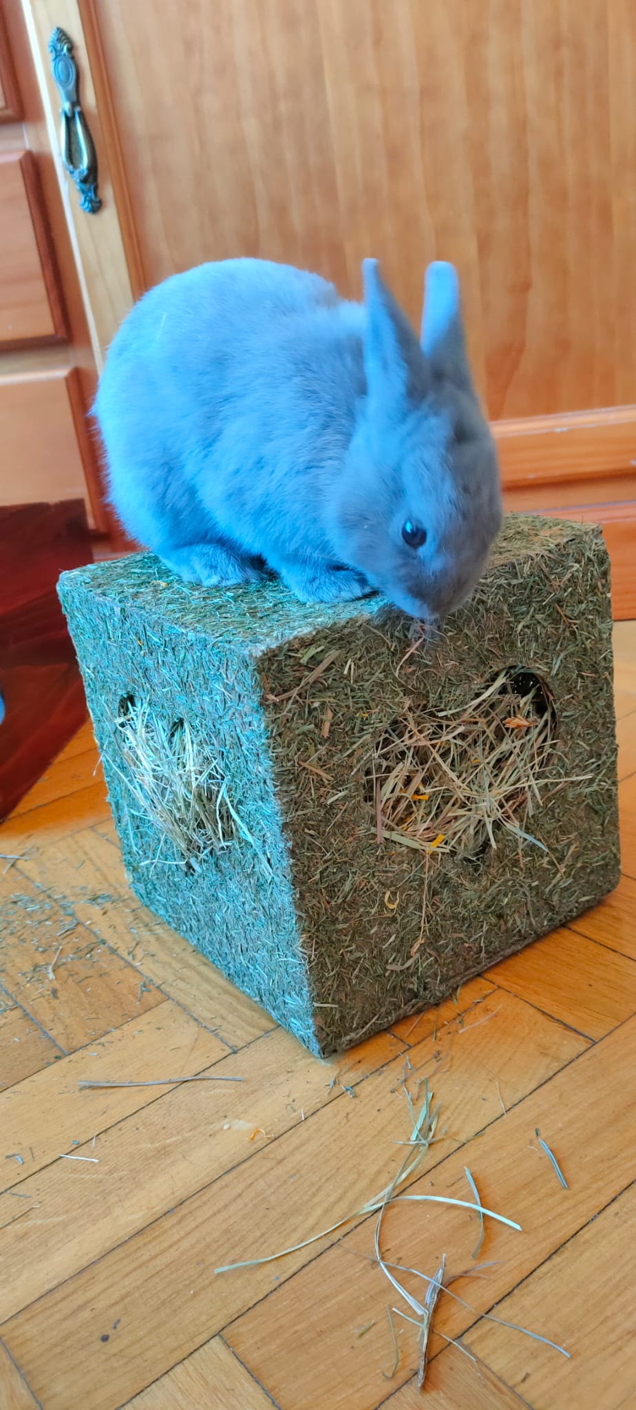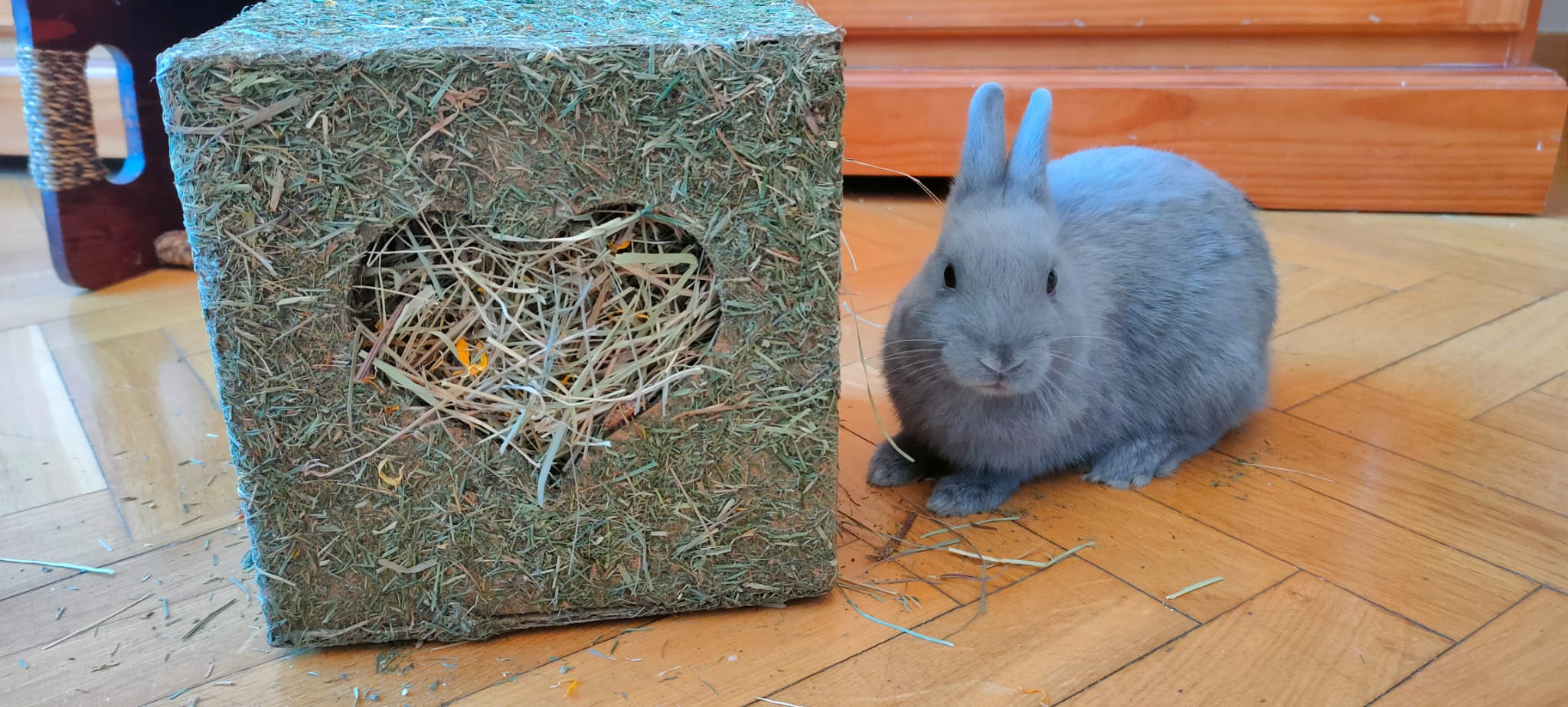 Divertido cubo para juegos, sus ventanas son corazones y dentro está totalmente relleno de heno, hierbas y flores de caléndula.
