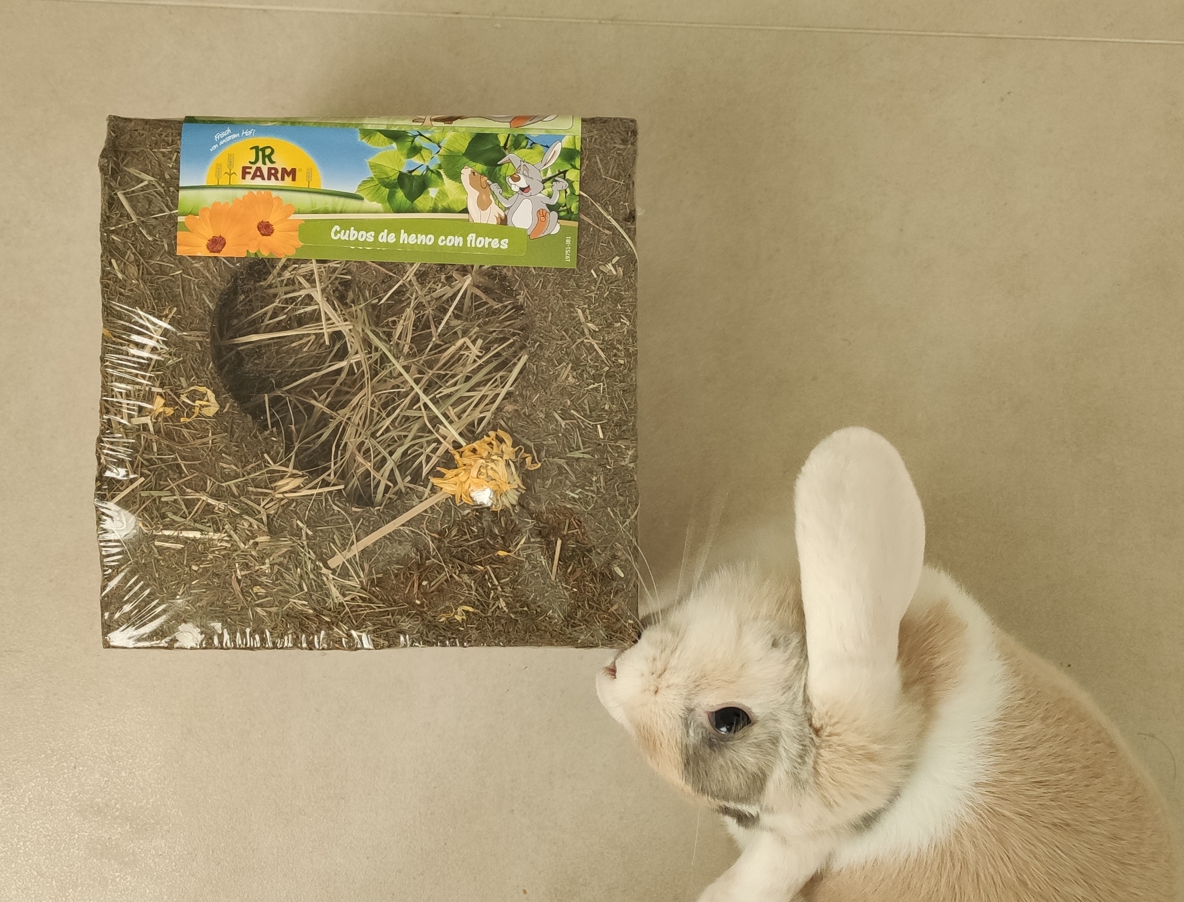 Composición: heno de pradera de montaña 52,7%, almidón vegetal 27,3%, lignocelulosa 17,7%, flores de caléndula 2,3%;
