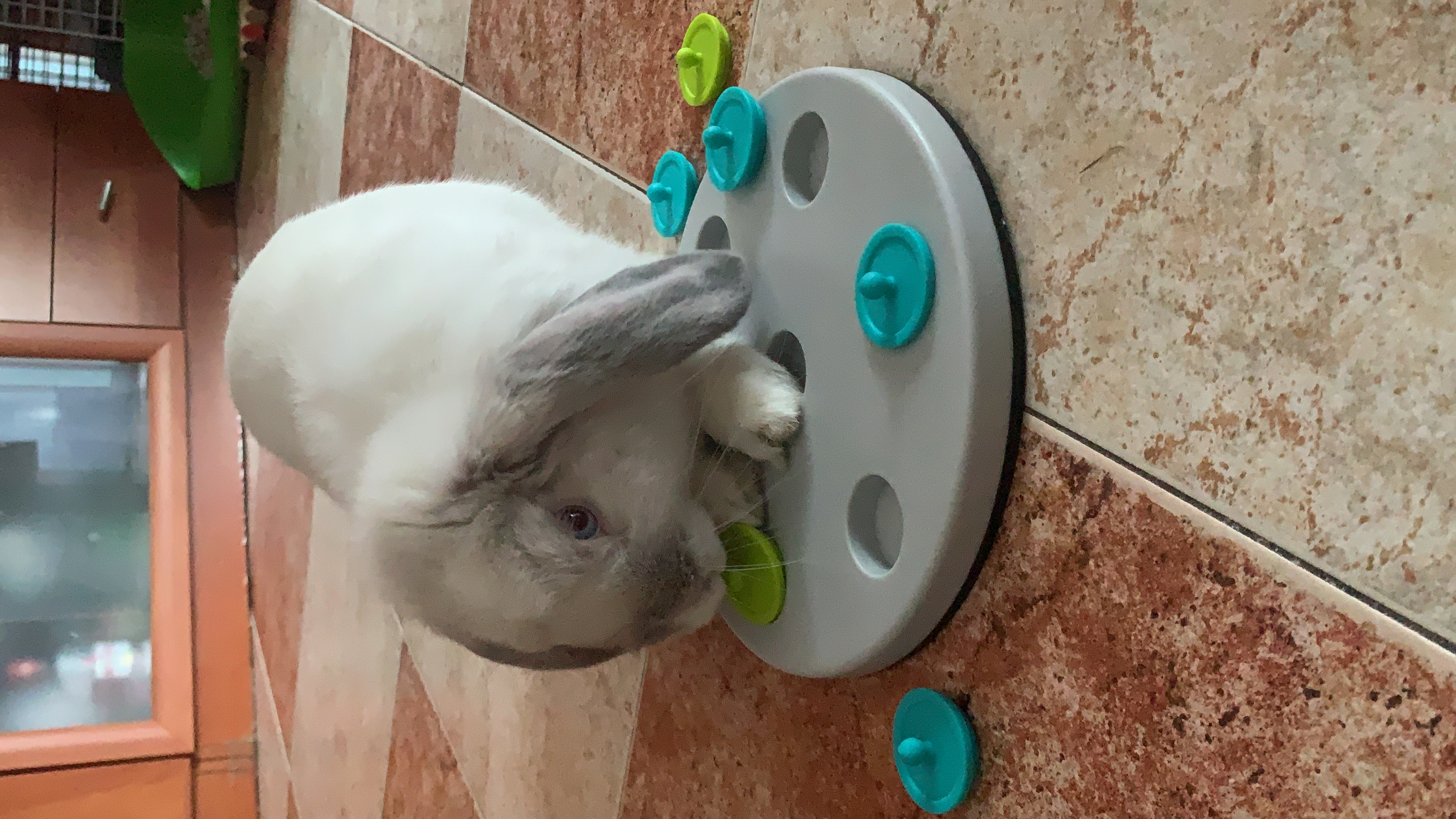 Tablero con 7 tapas: el animal debe levantar las tapas para obtener los premios.